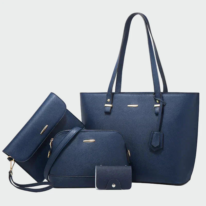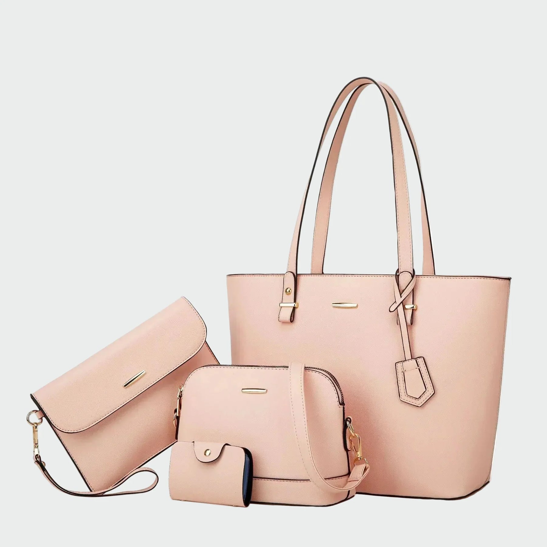 Σετ τσαντών σε μαύρη απόχρωση που συνδυάζει κομψότητα και πρακτικότητα σε κάθε λεπτομέρεια. Αποτελείται από μεγάλη τσάντα ώμου, μικρότερη χιαστί, φάκελο και πορτοφολάκι, όλα με μίνιμαλ σχεδιασμό και χρυσές λεπτομέρειες που χαρίζουν πολυτελή χαρακτήρα. Το ευρύχωρο εσωτερικό και οι πολλαπλές επιλογές μεταφοράς το καθιστούν ιδανικό για καθημερινή χρήση αλλά και πιο κομψές εμφανίσεις. Ένα ολοκληρωμένο σετ που καλύπτει κάθε σας ανάγκη με στυλ.