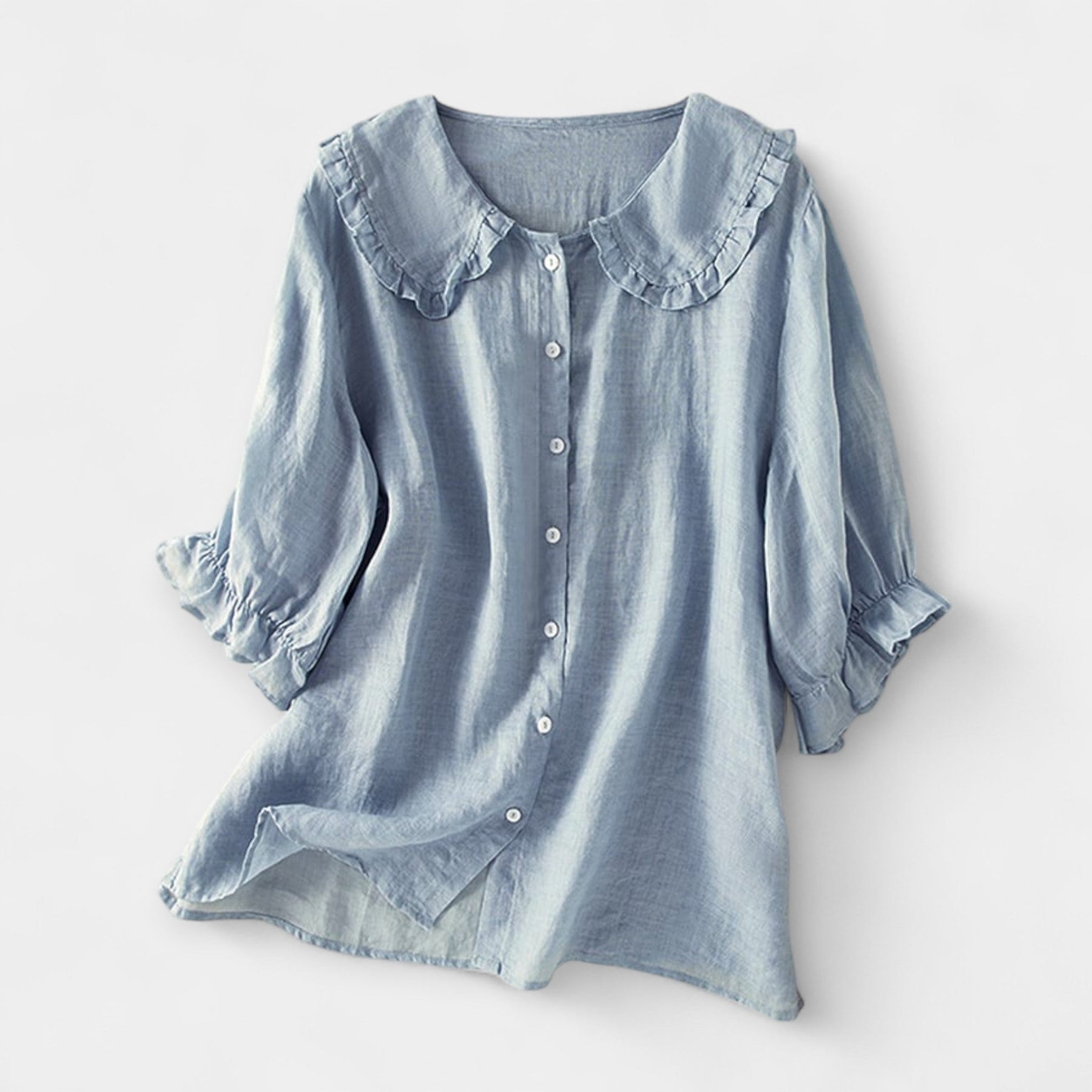 Ένα παιχνιδιάρικο πουκάμισο από ανάλαφρο μείγμα βαμβακιού και λίνου που συνδυάζει κομψότητα και άνεση. Ο γιακάς Peter Pan με βολάν προσθέτει μοναδική λεπτομέρεια που αναβαθμίζει κάθε casual εμφάνιση, ιδανικό για φούστες ή παντελόνες.