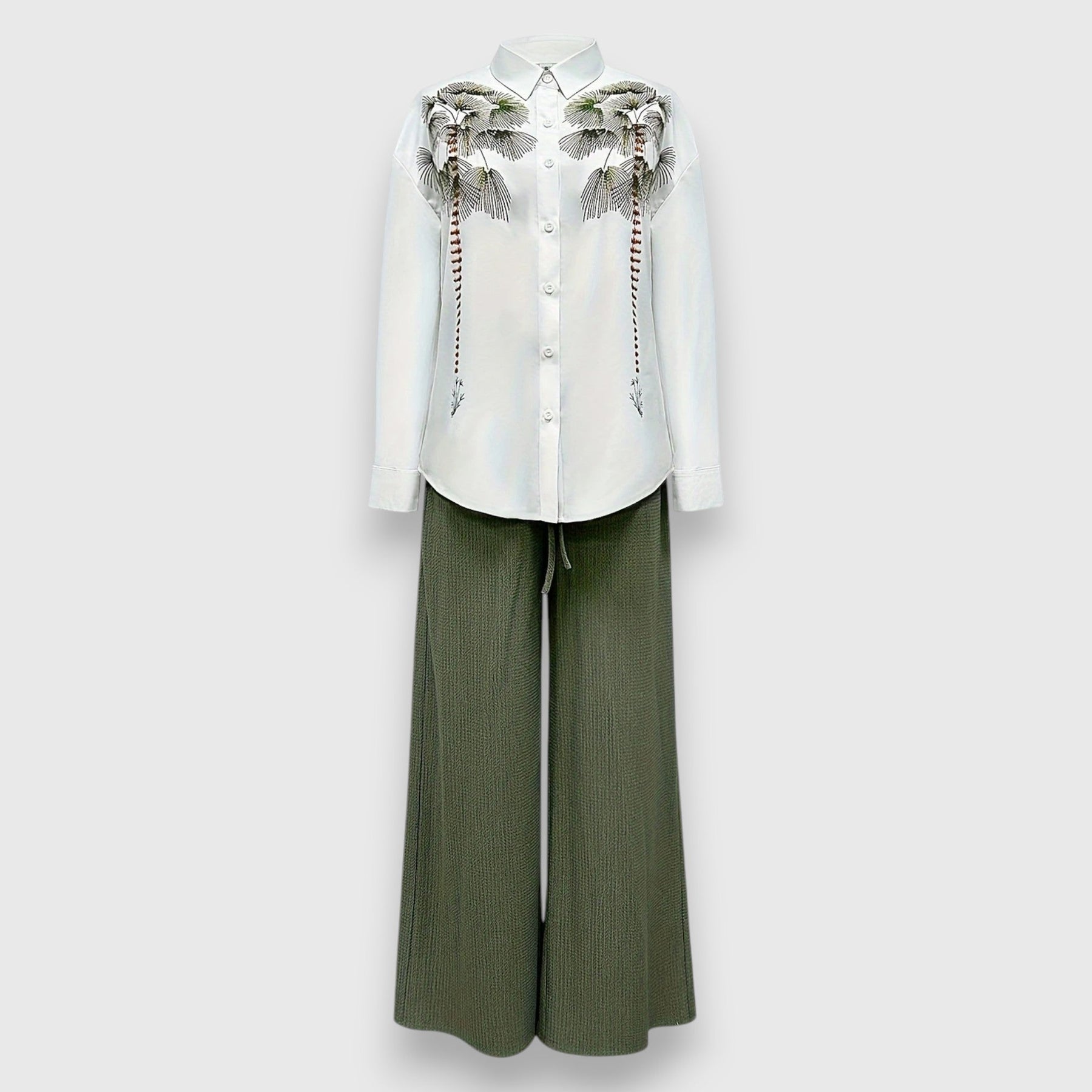Το σετ Νιβάνα συνδυάζει μια κομψή μπλούζα με λεπτό λουλουδάτο σχέδιο και ένα ρέον παντελόνι με φαρδιά πόδια – τέλειο για στιλάτες μέρες. Ο ελαφρύς ύφασμας και ο ψηλός γιακάς προσδίδουν στο σύνολο μια θηλυκή, απαιτητική νότα.