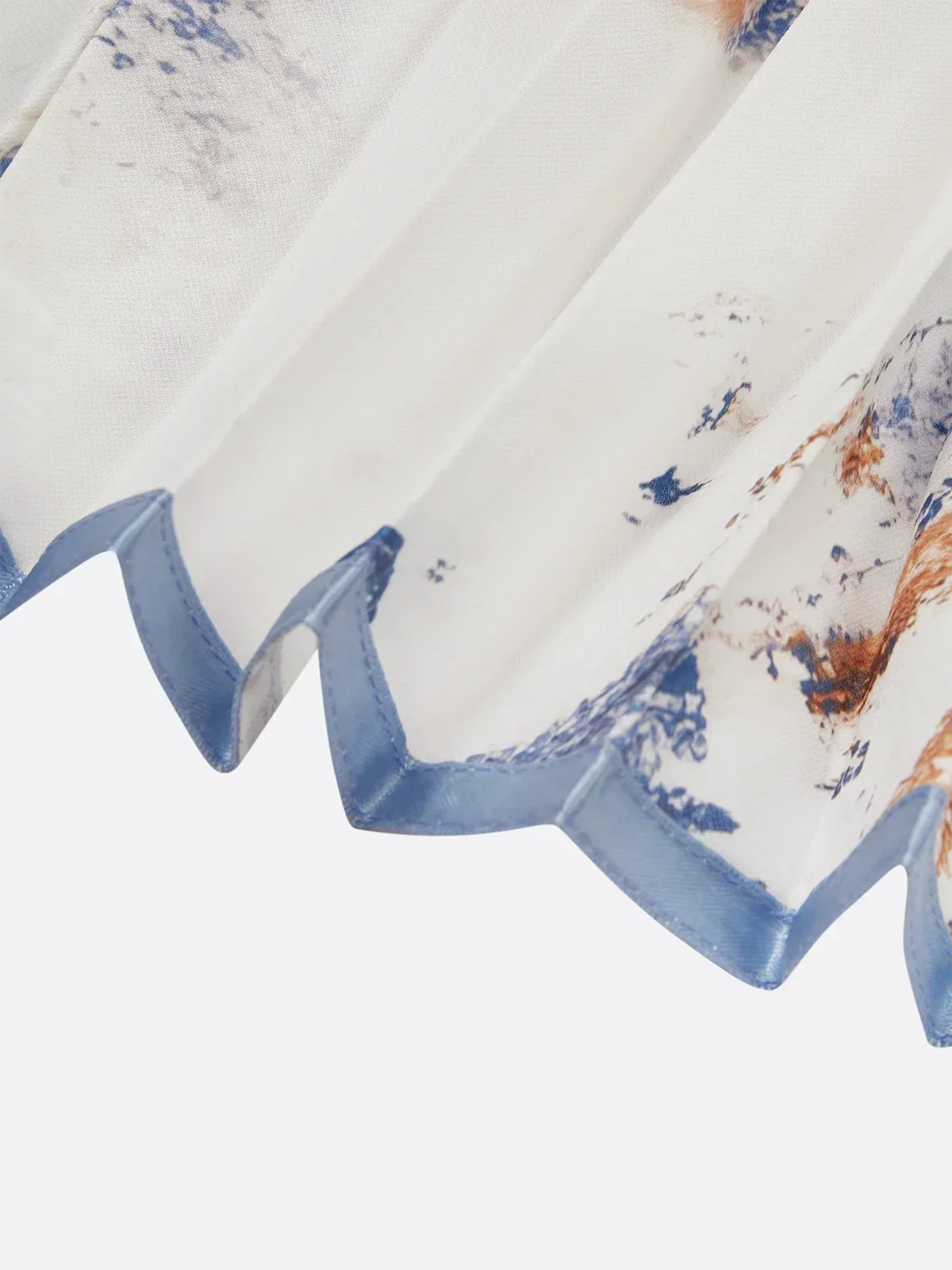 είναι η επιτομή της θηλυκής φινέτσας. Με βαθύ ντεκολτέ, ελαφριά πλισέ υφή και διακριτικό λουλουδάτο μοτίβο, προσφέρει αέρινη κίνηση και αριστοκρατικό στυλ. Η λεπτή μπλε ζώνη στη μέση αναδεικνύει τη σιλουέτα, χαρίζοντας κομψότητα σε κάθε βήμα.