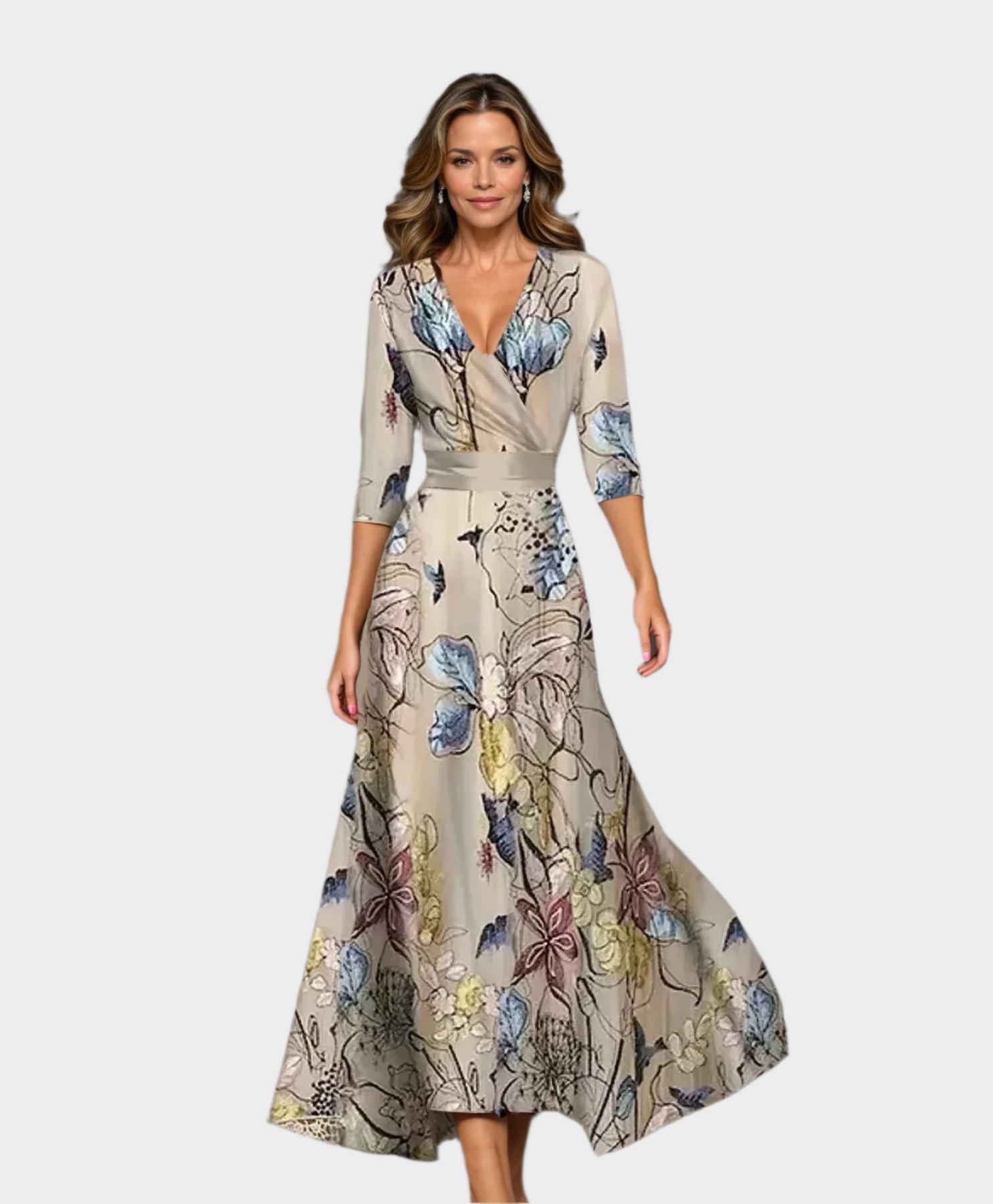 Ανακάλυψε τη διακριτική κομψότητα του. Αυτό το midi φόρεμα με V ντεκολτέ και μανίκια τριών τετάρτων συνδυάζει φινέτσα και άνεση, με έναν ζωγραφιστό λουλουδάτο σχεδιασμό που αναδεικνύει τη σιλουέτα με εκλεπτυσμένο τρόπο.