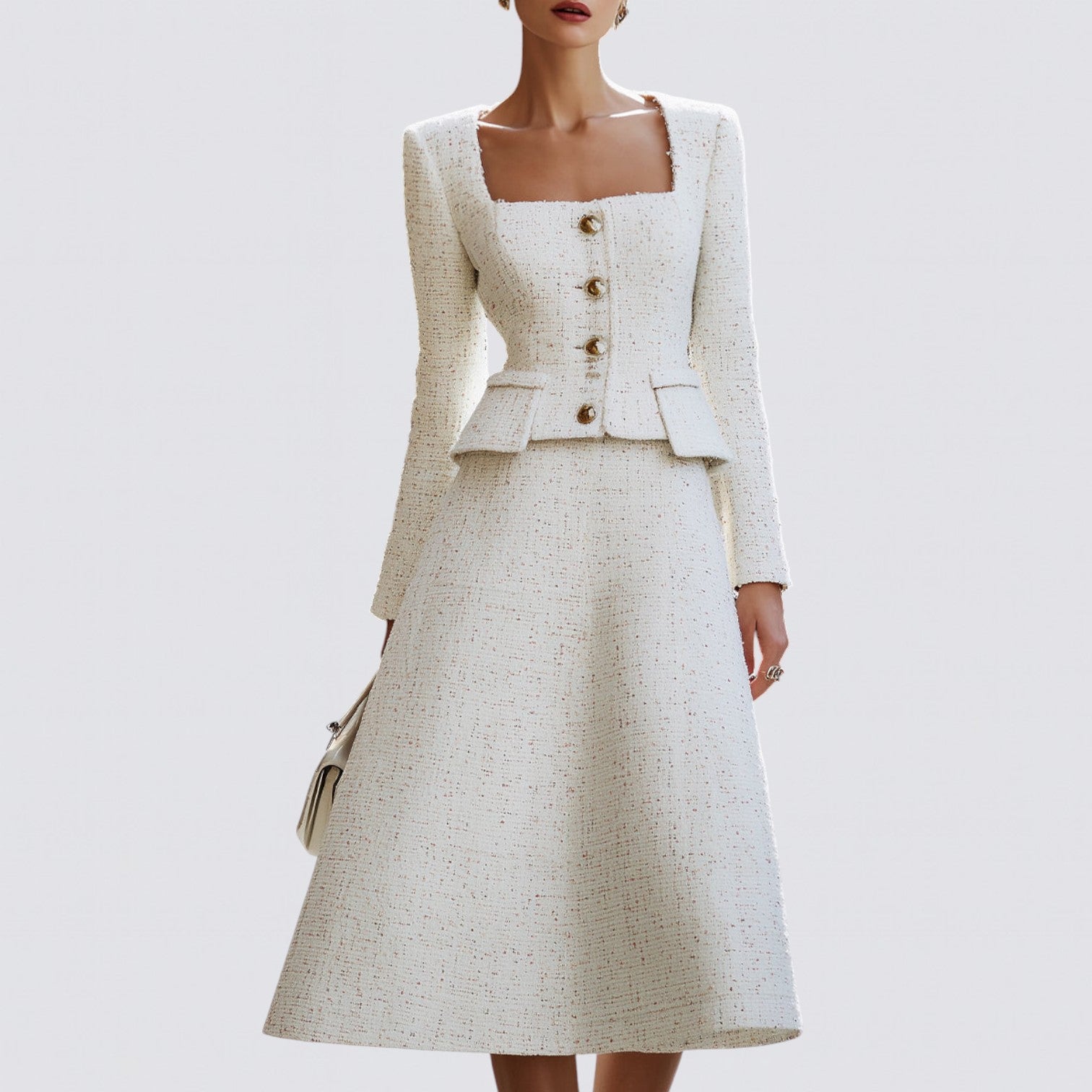 Αυτό το σετ από τουλί είναι η επιτομή της κομψότητας με τον προσεκτικό συνδυασμό κλασικής ραπτικής και σύγχρονης θηλυκότητας. Το σακάκι με τετράγωνη λαιμόκοψη, διακοσμημένο με χρυσά κουμπιά, κολακεύει την περιοχή του λαιμού ενώ σφίγγει κομψά στη μέση με λεπτομέρεια peplum. Συνδυασμένο με μια φουστάνι A-line, η σιλουέτα αποπνέει effortless sophistication και κίνηση.