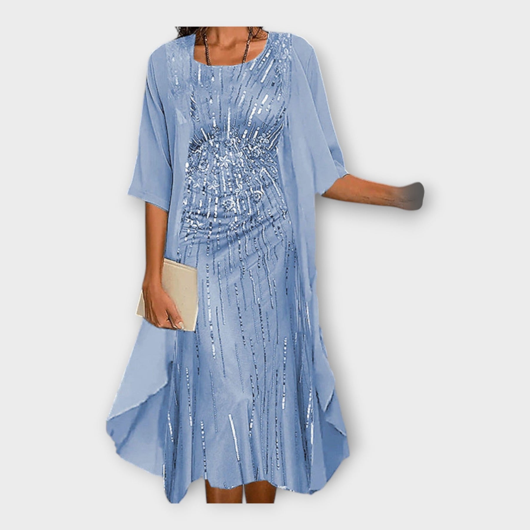 Αυτό το υπέροχο φόρεμα με την ασορτί ζακέτα συνδυάζει στυλ και άνεση, ιδανικό για κάθε περίσταση.